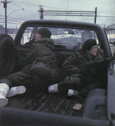 Lt. Marty Galvin, the stations air weapons controller, for example, could attest to the efficiency of the Airborne as hostage takers. Steward MCpl Lucien Leroux and his fellow sentry Pte Kim MacDougall, a radar tech, were equally impressed with Airborne MP, Sgt. Yves Cormiers ability to take out a sentry post - quickly and sneakily. As supply tech Cpl. Pat Leclair said, "I've learned one thing on this exercise and that's not to trust the Airborne."