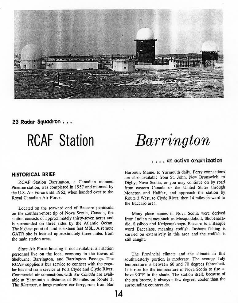 Since Air Force Housing is not available, all station personnel live on the local economy in the towns of Shelburne, Barrington and Barrington Passage. The RCAF supplies a bus service to connect with the regular bus and train service at Port Clyde and Clyde River. Commercial air connections with Air Canada are available at Yarmouth a distance of 80 miles on Route 3. The Bluenose, a large modern car ferry, runs from Bar Harbour, Maine to Yarmouth daily. Ferry connections are also available from St. John, New Brunswick, to Digby, Nova Scotia, or you may continue on by road from eastern Canada or the United States through Moncton and Halifax, and approach the station by Route 3 West, to Clyde River, then 14 miles seaward to the Baccaro area.