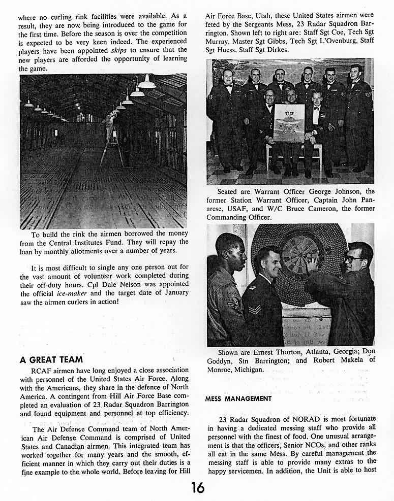 The occasion was a memorable one, as the comparatively small radar unit had, up to that time, rather limited recreational facilities. A large number of the airmen originally came from areas in the Maritimes where no curling rink facilities were available. As a result, they are now being introduced to the game for the first time. Before the season is over the competition is expected to be very keen indeed. The experienced players have been appointed skips to ensure that the new players are afforded the opportunity of learning the game.
