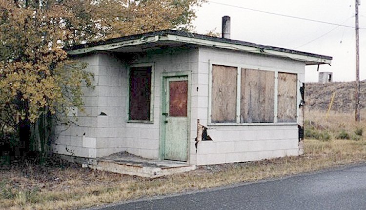 The first sign of military life was evident as you reached a small boarded up white building (about 1 km from the highway) on the left hand side of the road. This, evidently, was the guardhouse. There was no barrier crossing the road, as was evident in the days of an operational military base. Nor were there any signs remaining (such as Welcome to USAF Base Puntzi Mountain or RCAF Station Puntzi Mountain). You could still see what appeared to be a mound of elevated soil in the background, with small cement structures on the top. A walk around the guardhouse building verified that it was totally boarded - thereby denying the curious (like myself) of any chance to see what was inside. The only exception was at the back, where a window with bars allowed viewing of the interior, a small room, the size of a modern day bathroom.