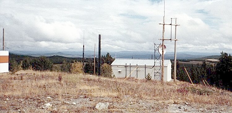 If you wanted to get to the area where the old radar station once stood, you must return to the area where the base camp once stood and drive by the trailers. You would soon find yourself on a gravel road and 9.8 km later, you arrive at the summit. It is not a difficult drive, nor is it as steep as the drive in Holberg or Kamloops. It is suggested that you keep an eye on your mileage odometer. At 7.7 km from the start of the gravel road (2.1 km from the top) you will notice a somewhat narrow road leading off to the right. If you stop and investigate, you will see that this road was once asphalt. I drove in about 3 or 4 km's, and there is nothing there. The shrubs and trees are slowly closing in on this area - and it may well be impassable in another 3 or 4 years. I subsequently heard that the initial military base design had a split layout for their transmitter and receiver sites. It is safe to assume that a transmitter site or a receiver site could have been located in this area.