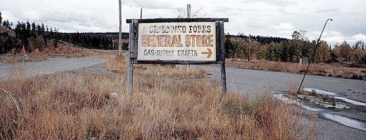 The road map shows a town of Chilanko Forks, but this is quite misleading as there is nothing there. Discussions with locals indicated the original location of Chilanko Forks was further west than the cutoff to Puntzi. Apparently, the town or whatever, was relocated and on returning towards William's Lake on highway 20, you will see a sign (right hand side of the highway) that points in to the Chilanko Forks General Store. If you stop to have a look, all that you will see is the cement base structure of a burnt out building.