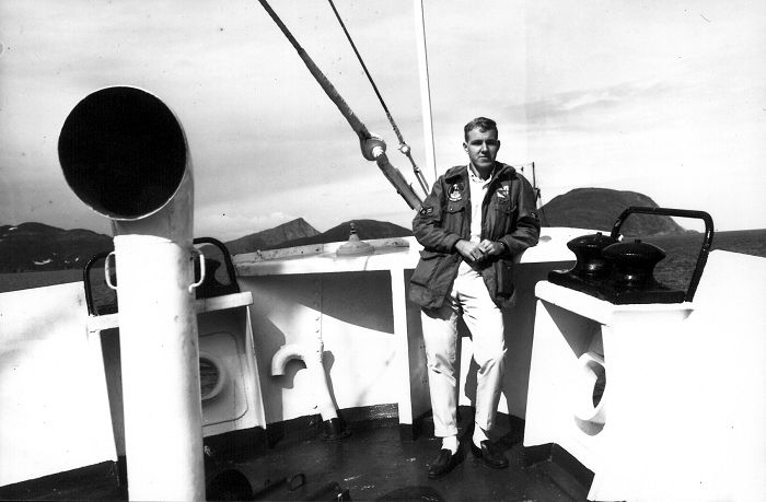 - Don Legler on the bow deck of the supply ship "Sir John Crosbie" - July 1963.