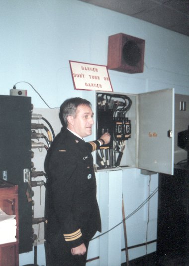 - Officer Cadet (formerly Cpl) Jerrard Marcil-Dallaire throws the second switch to power down the AN/FPS-6B - 1 January 1987.