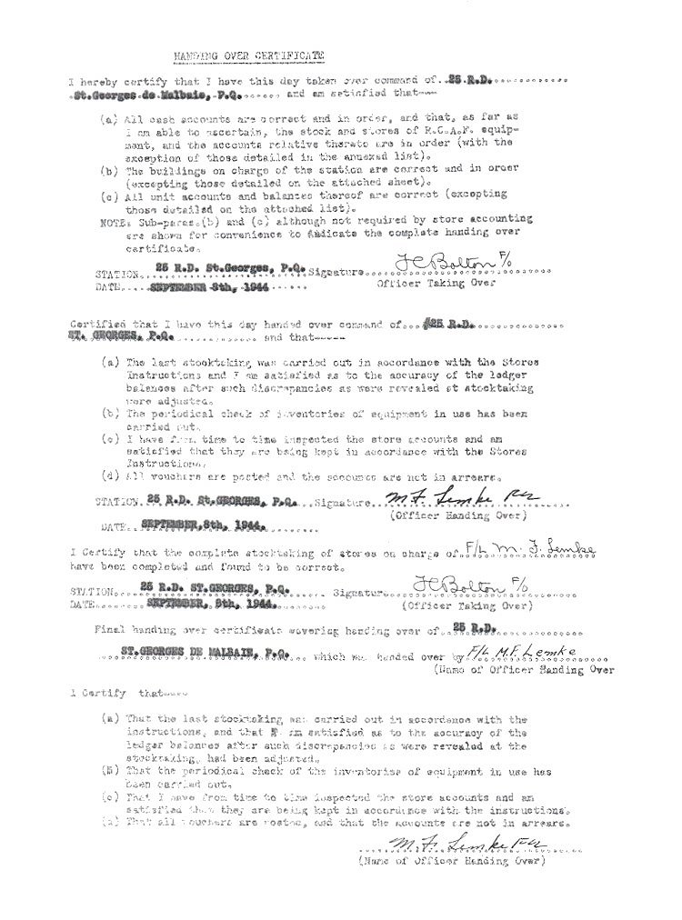 Handover Certificate - 8 September 1944.