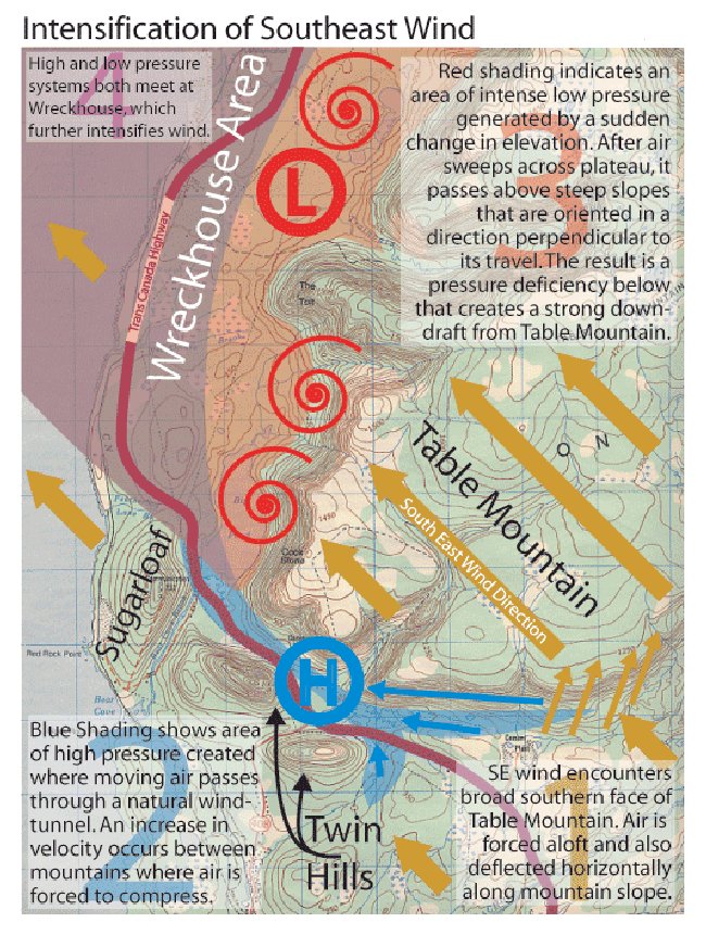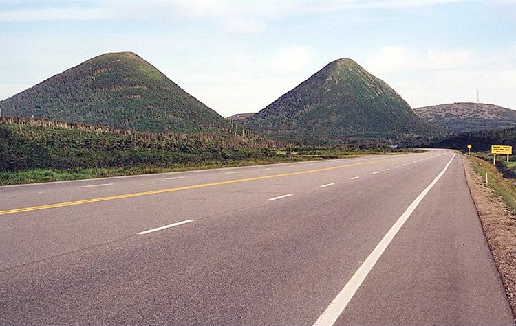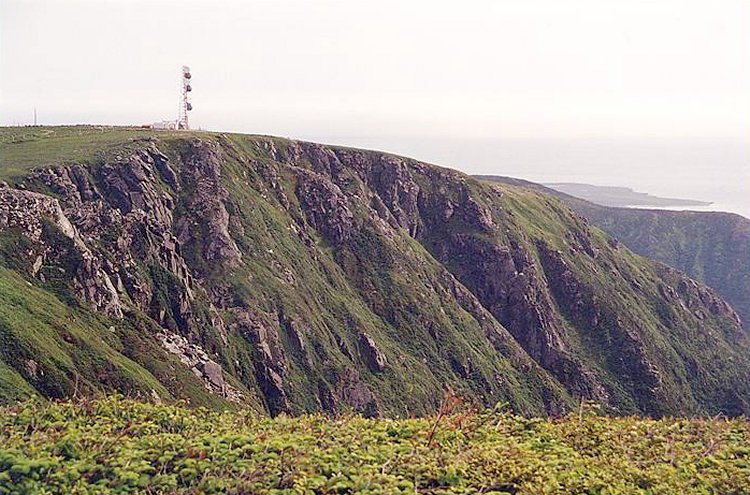 Directly below, in plain sight is the Trans Canada Highway, Big Pond's south end, Red Rocks Road as it follows Bear Cove Brook through a valley and beyond that, open waters of Cabot Strait/Gulf of St. Lawrence. That mountain to our right with a wavy pattern in its forested slopes is Sugarloaf.
