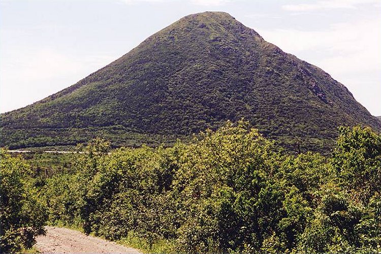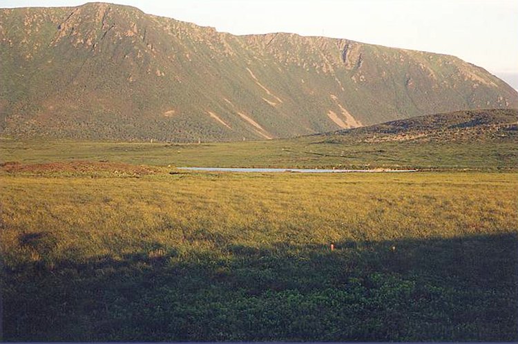 - View from the Trans Canada Highway looking south towards the broad flat slopes of Table Mountain - July 2000.