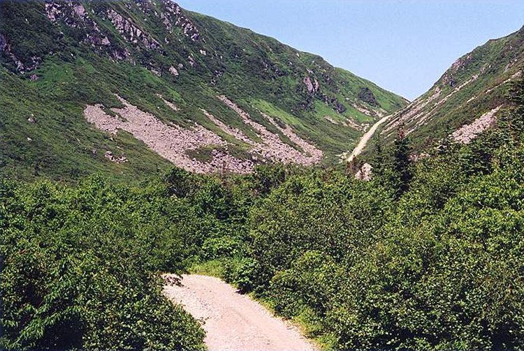 - View on the trail just before it makes its turn and you continue down a steep slope - July 2000.