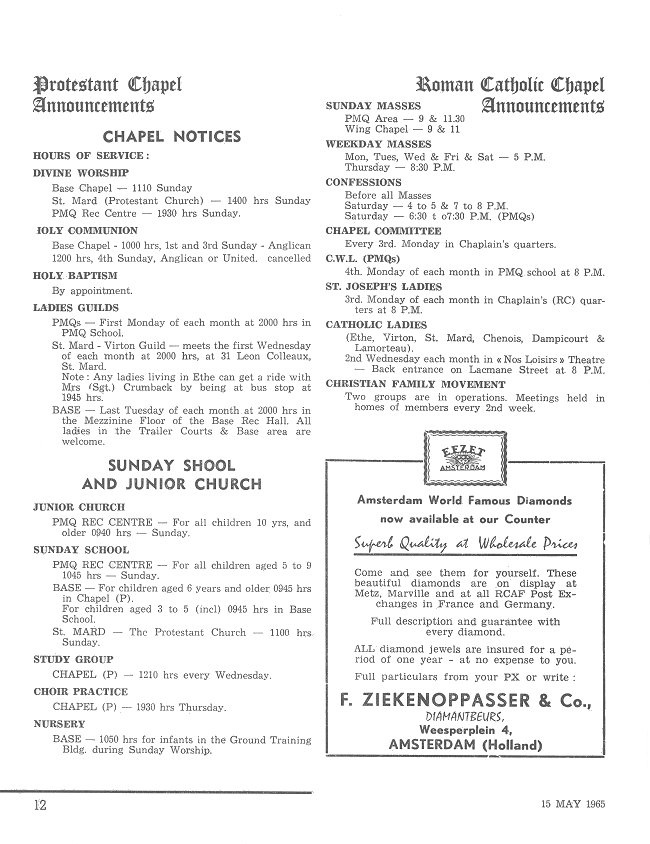 - Protestant Chapel and Roman Catholic Chapel Announcements, page 12 - 15 May 1965