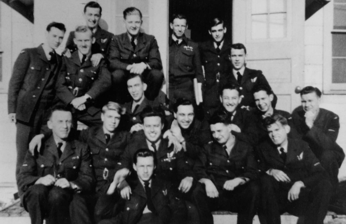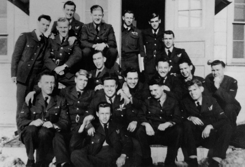 Back row (L-R) - LAC Al MacKenzie, S/L Cowie (S&R Pilot), AC2 Dick Suderman, LAC ? Roy. Middle row (L-R) - AC2 "Ding" Bell (not George), AC2 Bill Robbins, LAC Harry Bleay, AC2 "Dong" Bell, AC2 Harry Maclachlan, Unknown, LAC Bob Angst. Front row (L-R) - LAC Dunc MacEachern, AC2 Harry Clayton, Unknown, AC2 Chuch Shean, LAC Woodley. In front - LAC "Benny" Benesko. Missing - AC2 KD Macdonald, AC2 Titmarsh, AC2 Pres Rogers , AC2 Vic Gray (Photographer).