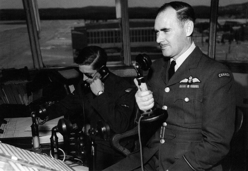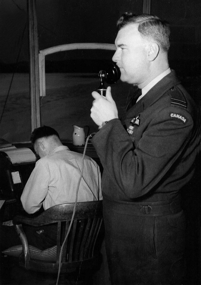 LAC Vic Gray and F/O Helgeson working in the control tower - 1952.