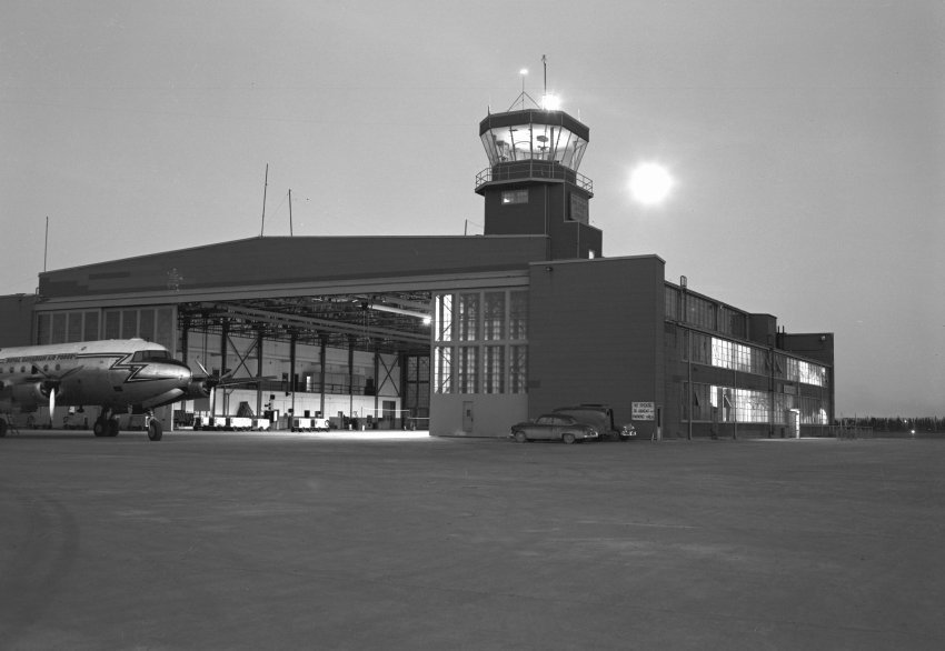 Night view of the main hanagr and the control tower - 30 September 1952.