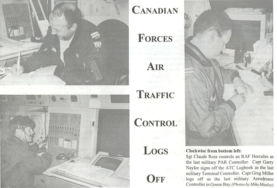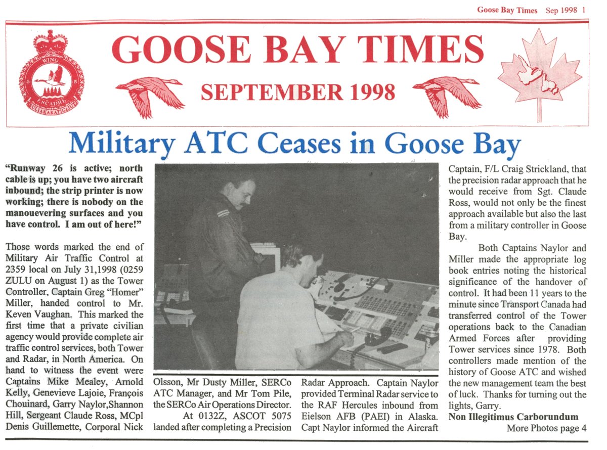 Military Air Traffic Control ended in 1998 at Goose Bay. However, from that time until 2004, the Air Force maintained 6 ATC positions in WOps (1 officer & 5 NCM's). Two positions were directly responsible for quality assurance of ATC, Met, & Transient Servicing - essentially monitoring Serco's performance in these areas under the terms of the contract. Four positions were employed in the Wing Ops Centre, working at the ops desk monitoring the overall daily flying program. Last year (2004), the base downsized the military positions again from approximately 92 to 40 (or thereabouts). Most of the working positions in Wing Operations were outsourced to Serco (including the ops desk) and the Quality Assurance functions were deleted altogether. Thus, there are no longer any military ATC positions at Goose Bay.