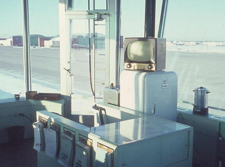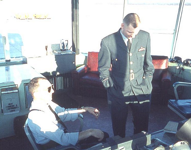 (L-R) F/L Bill Duff and F/O Berger-North in the control tower at Cold Lake - January 1966.