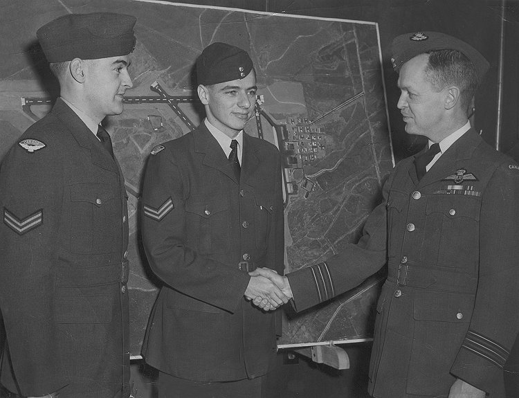 John Ferris and Bob Browner receiving congratulations from W/C Hunt, CO RCAF Station Torbay.