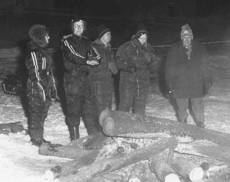 - Winter Carnival: Pete Ellis (far right) at bonfire with Skidooers - February 1971.