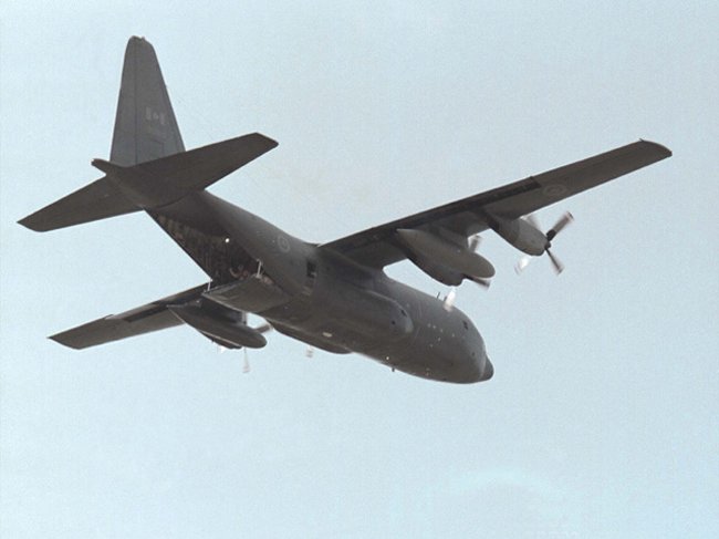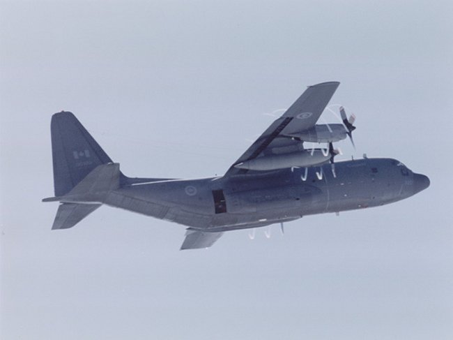 A C-130 Hercules from 413 (T&R) Squadron at Greenwood near a drop zone before a SAR jump - October 2001.
