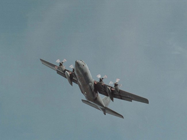 A C-130 Hercules from 413 (T&R) Squadron at Greenwood circling a drop zone before a SAR jump - 28 November 2001.