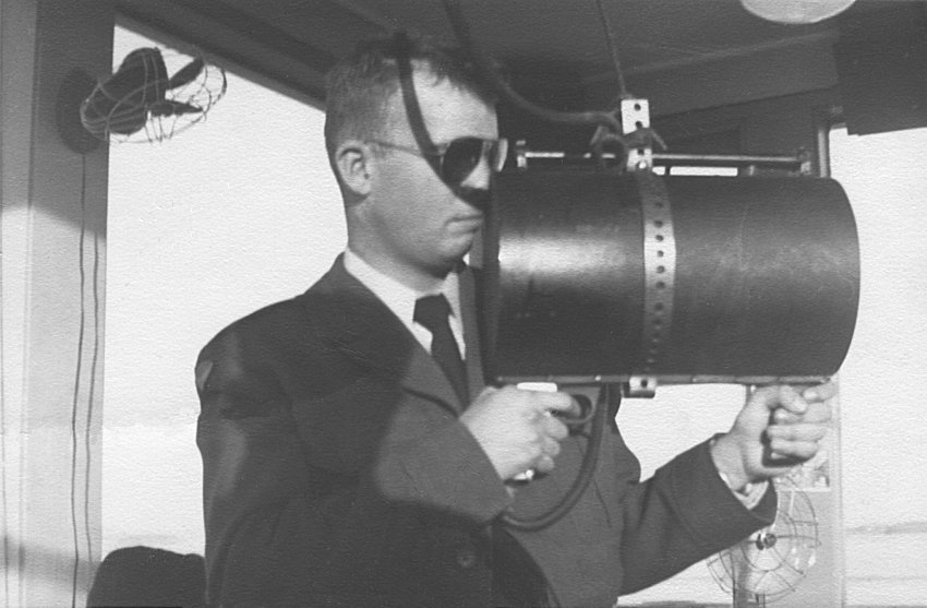 Unidentified airman with the Aldis lamp in the control tower - December 1951.