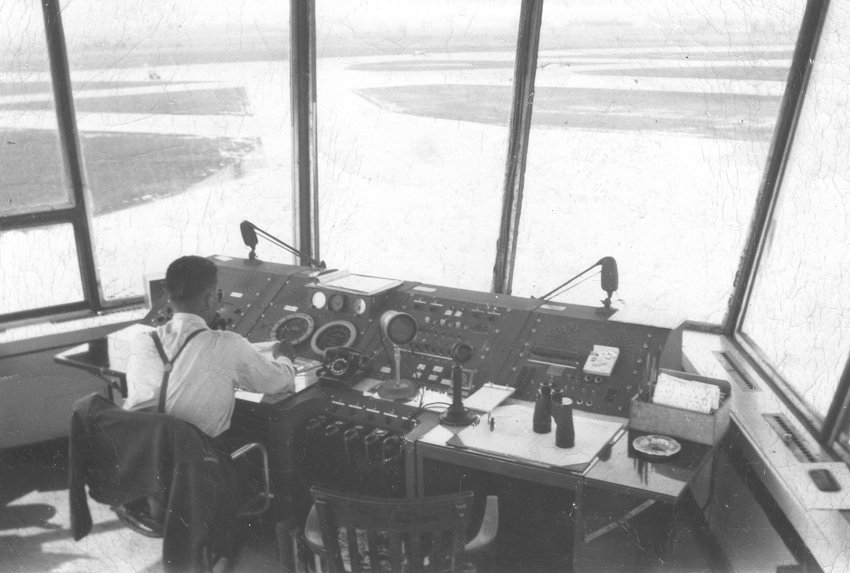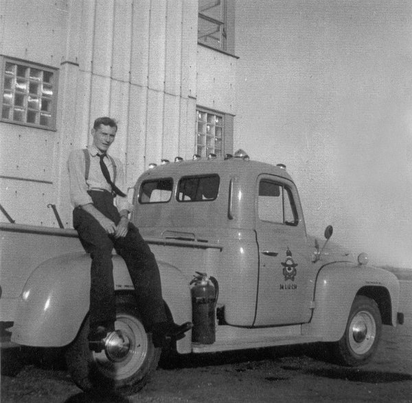 - Unidentified ACOp and the tower truck at the base of the control tower - May 1955.