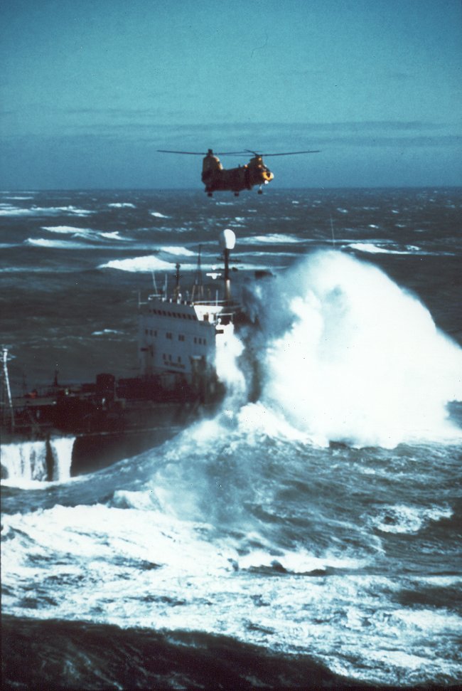 Getting into position to hoist crew members from the M/V "Rio Orango" which was floundering in the Atlantic Ocean off Canada's east coast.