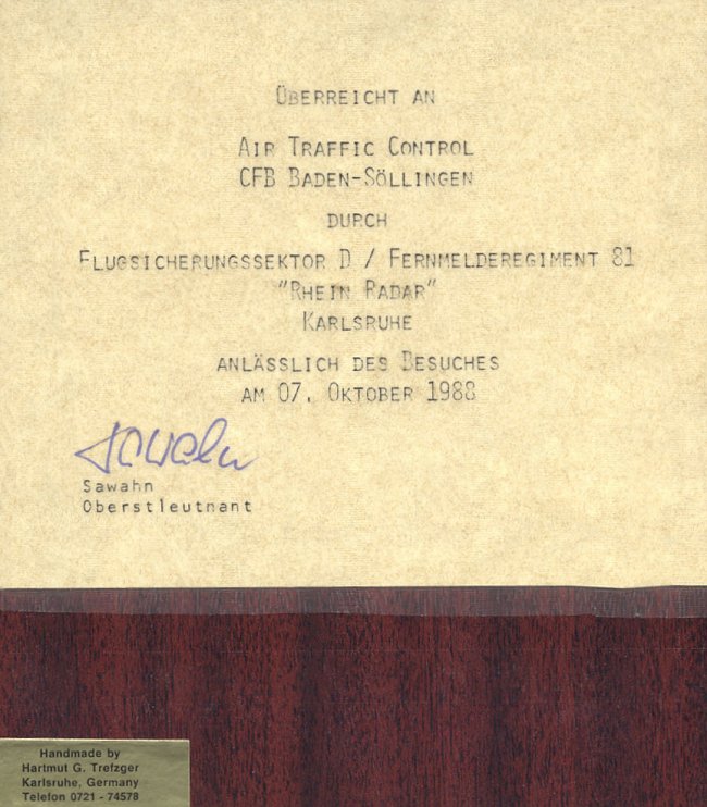 This was designed by Hartmut Trefzeger and presented to Baden ATC personnel to commemorate the visit by the Karlsruhe military ATC staff to Baden.