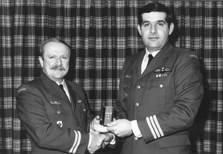- LCol Jack Bartram (WOpsO), presents Jim Dunn with the bar to his CD - 1989.