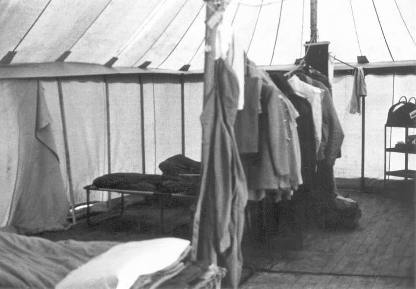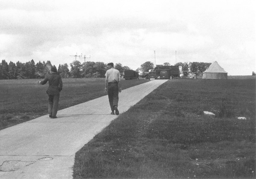 LAC Murray Nelson (Tower) and Cpl Bill Burt (Radar Tech) walk from the taxiway to the Mobile Control Tower and the Quad Radar (GCA) site. Note the tent accommodation on the right.