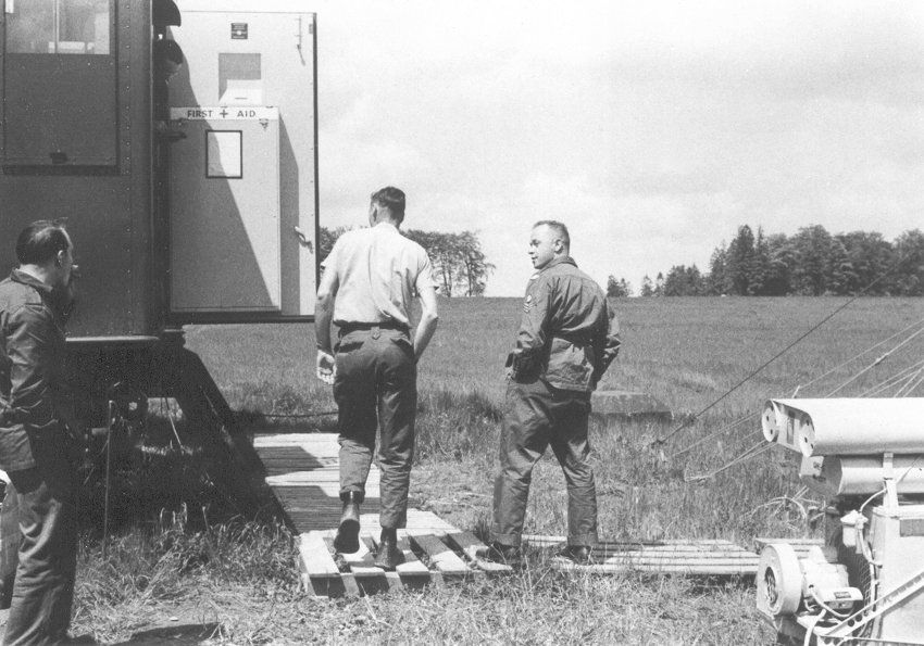 Quad Radar (GCA) trailer and the control tower trailer. Cpl Bill Burt (back visible) has entered the Quad Radar (GCA) mobile unit.