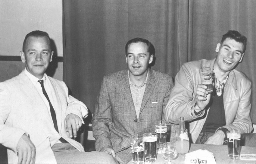 (L-R) - LAC Murray Nelson (tower), Cpl Bill Burt (Radar Tech), FS Alex MacDougal (GCA Controller) at the Quad radar site. Cpl John Bard (Radar Tech) is in the doorway.