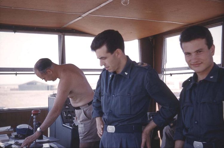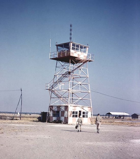 F/L Gil Gilbert with two Italian observers in the control tower at Decimommanau - June 1960.