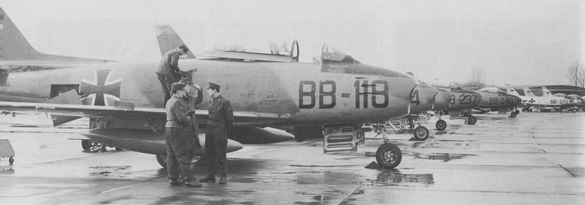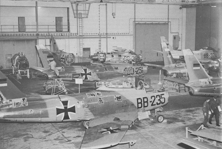 Overall view in the barn at Oldenburg with Sabres in various stages of maintenance - 1959.