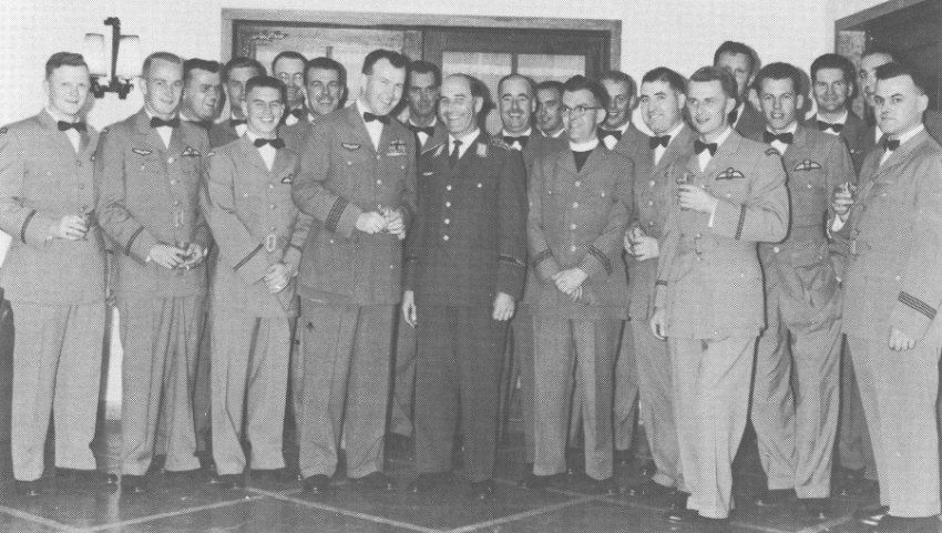 (L-R) - Red Reiffer, Bill Van Oene, Con Platz, Alex Leslie, Bill Krantz (ATC), Jack McDonnell (Canadair), Al Sherwin, S/L "Duke" Warren, Jim McCann, OTL Wehnelt, Walt Moore, Lew Mann, Padre Jenks, Reg Heard, Warner Unruh (Admin), Pete Caws, Glen Hollingshead, Brian Bell, Pete Lenton (ATC), Bob Flynn, Andy Bourdeleau (EO).