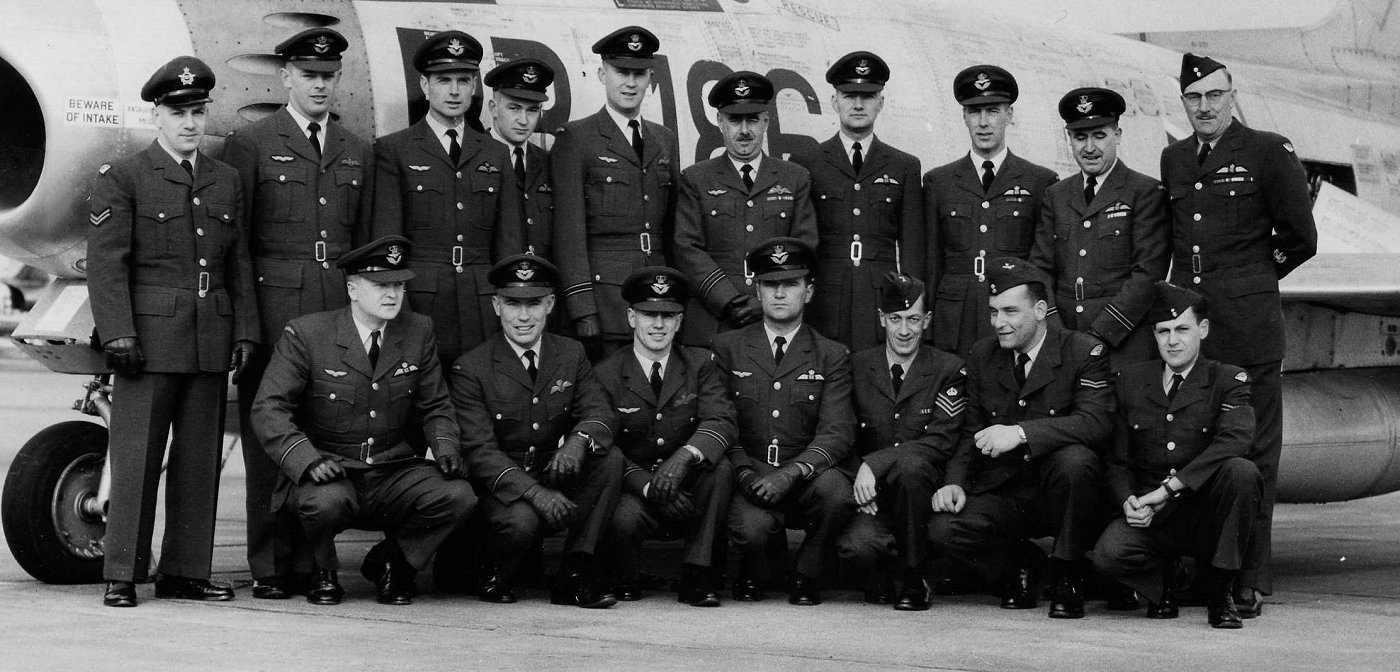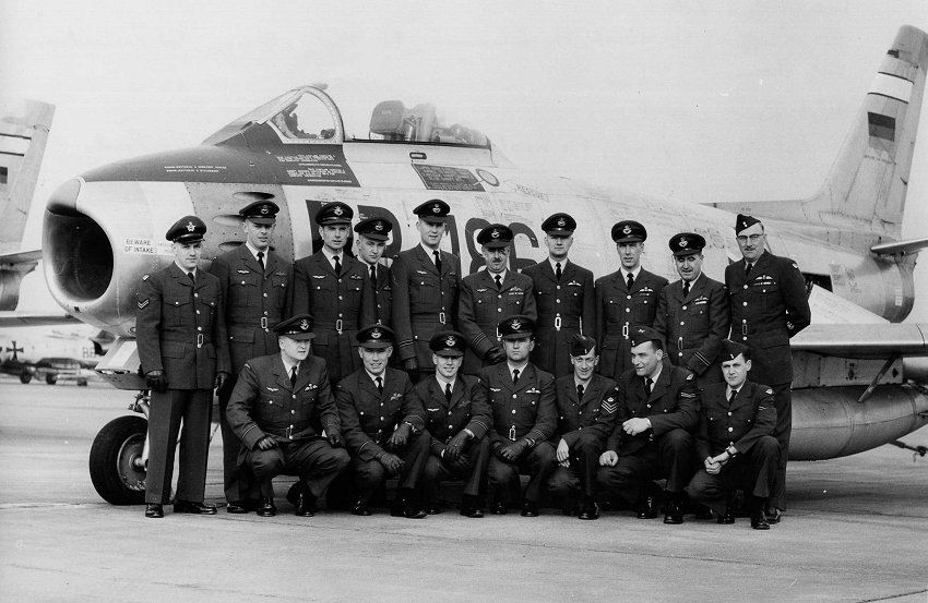 Back row (L-R) - Cpl Labelle, F/O Small, F/L Inksater, F/L Unruh, WO2 Thomas. Front row (L-R) - F/O Reifer, F/O Kuch, F/L Sherwin, F/L Platz, FS Gray, Cpl Richardson, Cpl Green. Missing - F/L Lenton. Note that 7 of the RCAF pilots also wear the wings of the German Air Force.